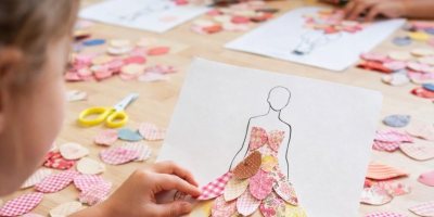 עיצוב ובניית סקיצת אופנה מגזרי בדים בצורת עלים בהשראת התערוכה המוצגת במוזיאון.