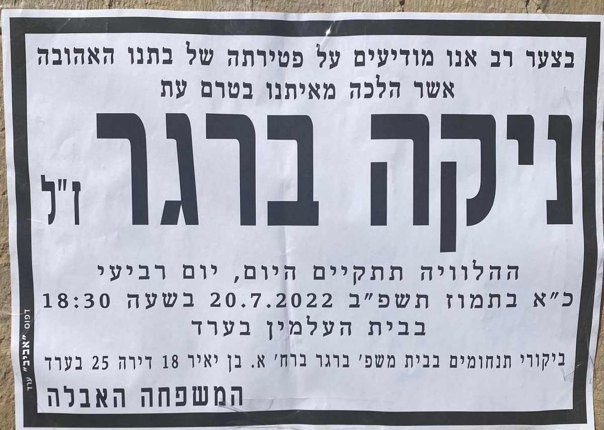"הייתה מקצועית ורגישה לזולת ובעלת אינטליגנציה רגשית גבוהה מאוד": טרגדיה מקומית קשה במיוחד פקדה את העיר ערד השבוע, זאת לאחר פטירתה של תושבת המקום - ניקה ברגר בת ה-19. ברגר ז"ל נפטרה באופן פתאומי ביום ג' האחרון והותירה אחריה משפחה אוהבת. הלווייתה נערכה אמש בבית העלמין בערד.