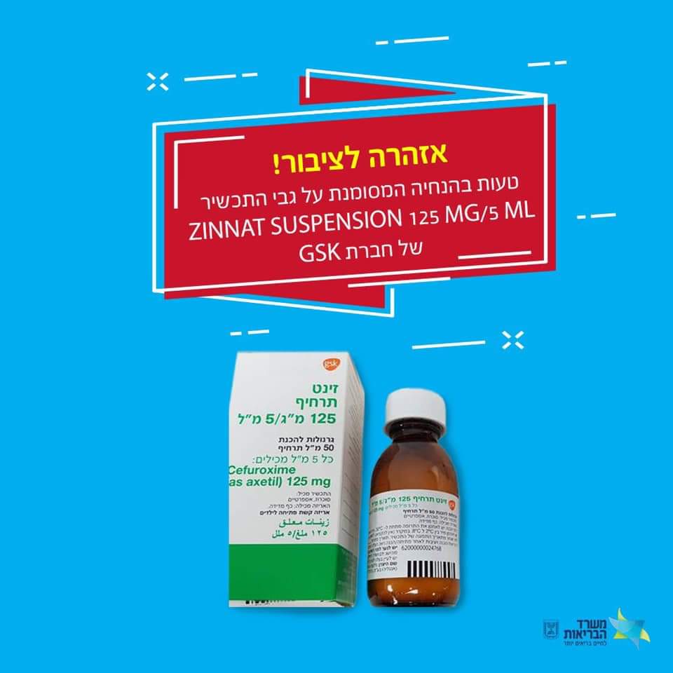 החזרה מהשוק של התכשיר ZINNAT SUSPENSION 125 MG/5 ML זינט תרחיף 125מ"ג/5מ"ל אצווה YX5S חברת GSK, בשיתוף עם משרד הבריאות הישראלי, מודיעה על איסוף תכשיר ZINNAT SUSPENSION 125 MG/5 ML מאצווה YX5S(תאריך תפוגה אפריל 2021) מרמת המטופל.