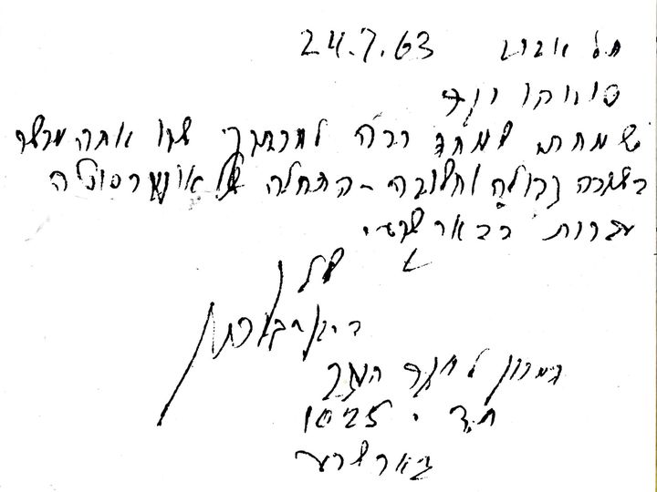 "טוביהו יקר,שמחתי שמחה רבה למכתבך שבו אתה מבשר בשורה גדולה וחשובה - התחלה של אוניברסיטה עברית בבאר שבע. שלך, דוד בן-גוריון" (מידע באדיבות אוניברסיטת בן גוריון).