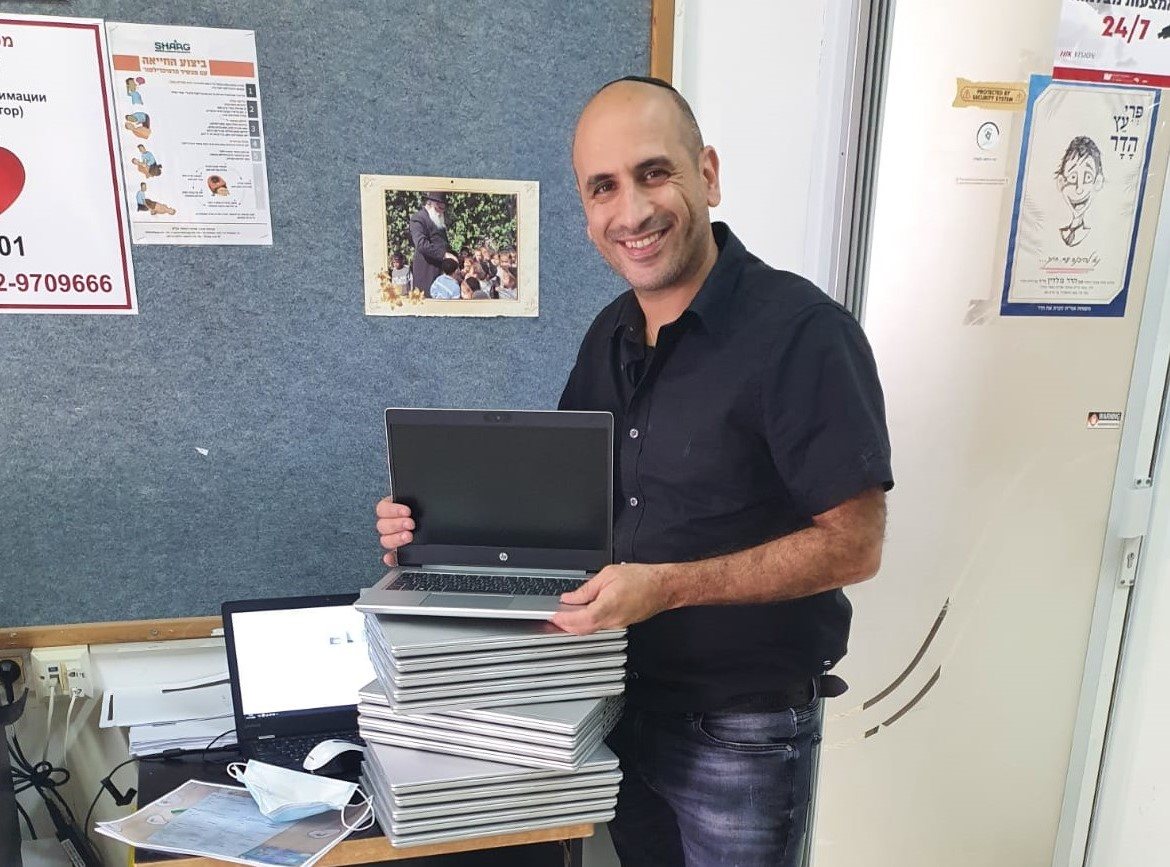 יוסי חן, רכז תקשוב הבית ספרי מכין למסירה את המחשבים שהתקבלו
