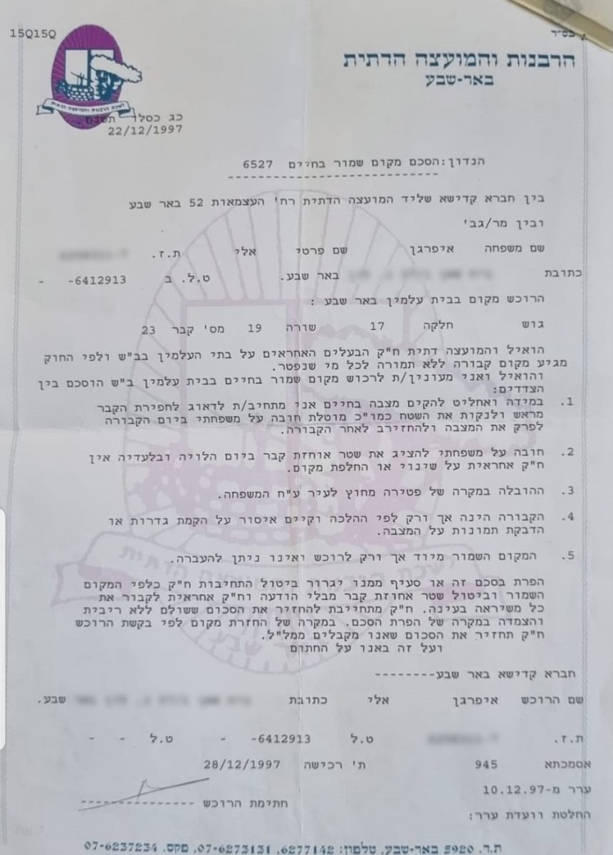 התיעוד לרכישת החלקה שבידיה של רווית. קרדיט - צילום פרטי"זה כל כך מקומם אותי. אבא שלי היה בן אדם מאד תמים, איש שמיים, שומר צדק שכל כך נתן את מבטחו בגוף הזה שנקרא הרבנות. הוא היה אדם דתי, ואיך יכול להיות שבערוב ימיו של בן אדם אי אפשר לחלוק לו כבוד אחרון? זה דבר בסיסי. הוא אף פעם לא חשד ולא בדק, כי הוא סמך עליהם''.