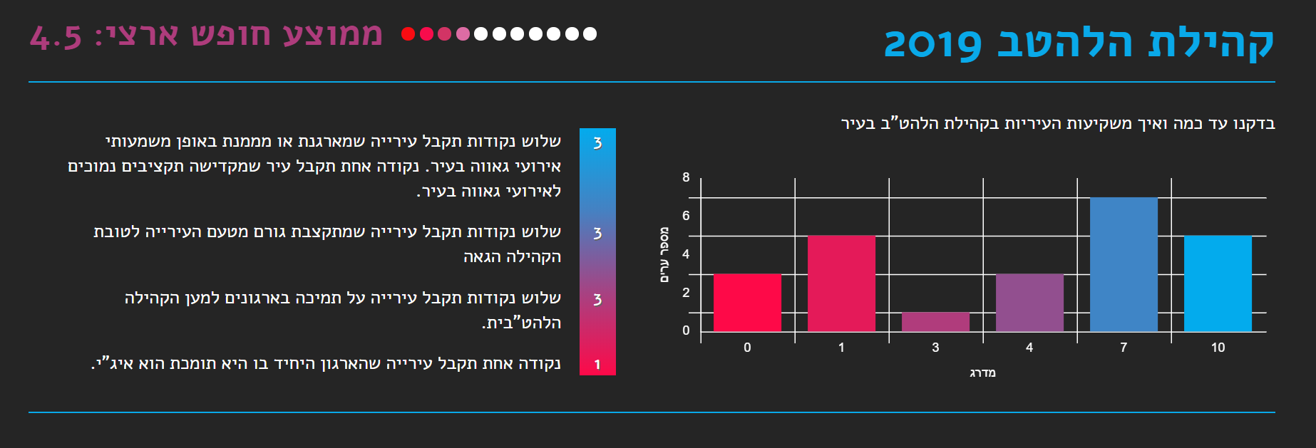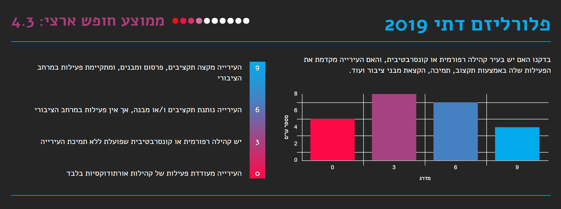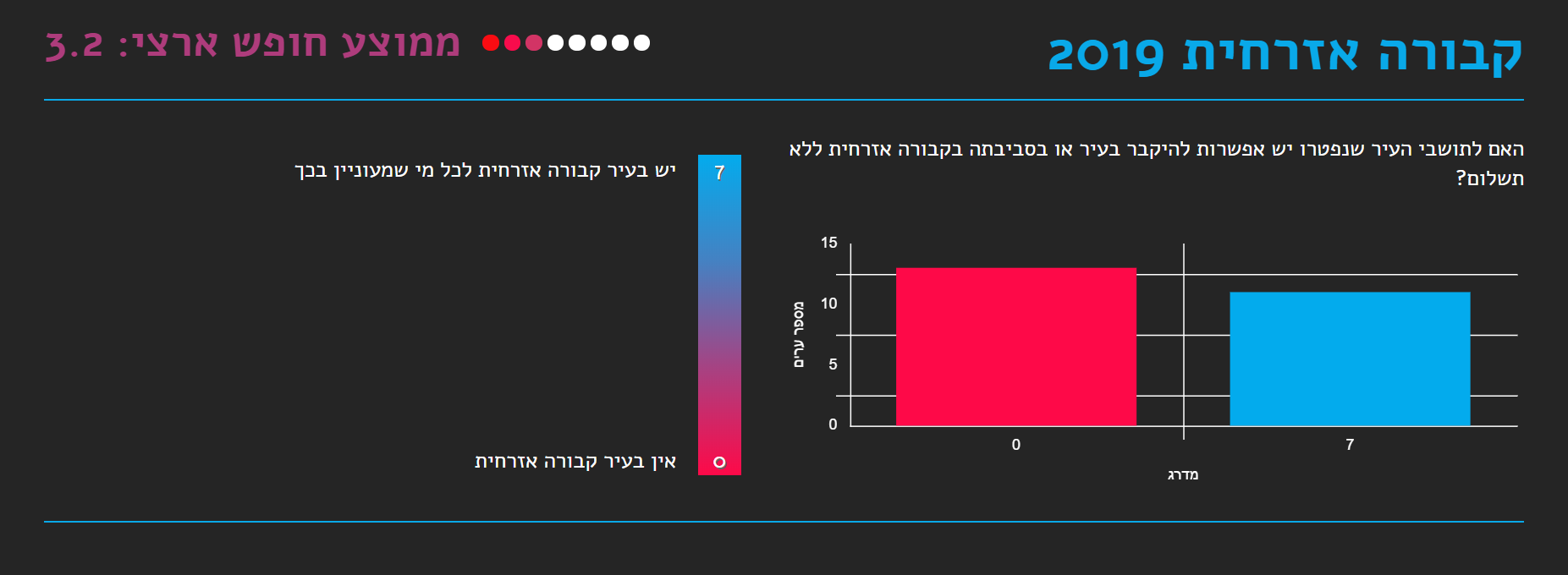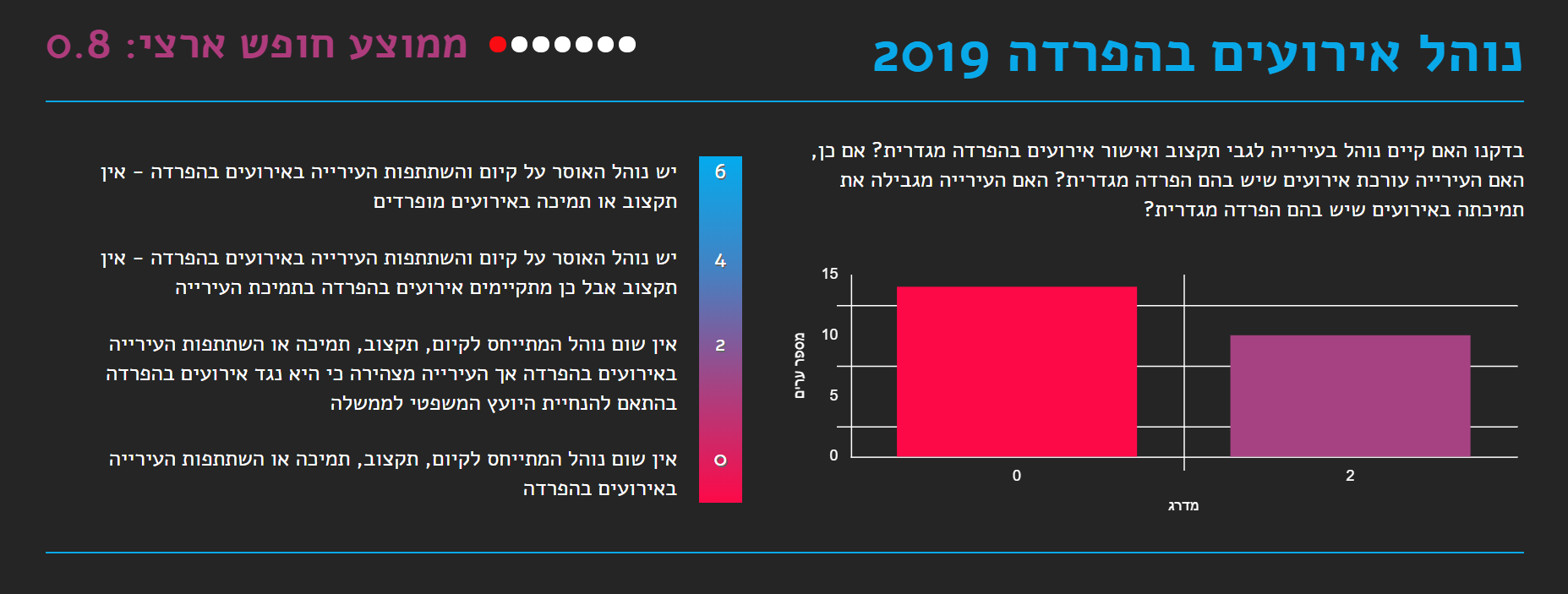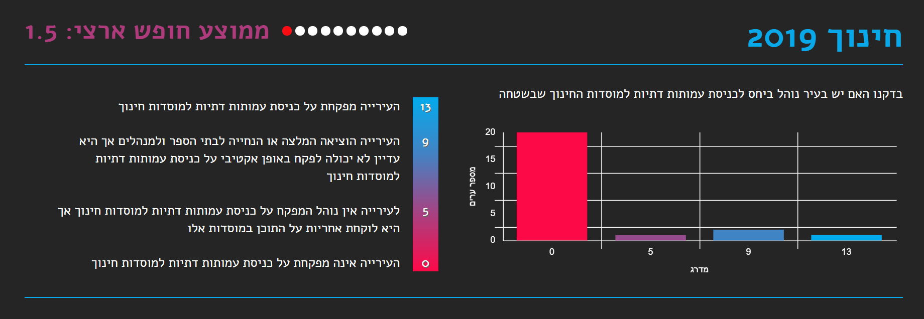 תקציבי דת מועצה דתית - 8,173,088 ש״ח תרבות תורנית + תמיכות - 4,093,583 ש״ח שיעור תקציבי הדת ביחס לתקציב העיר הכללי: 0.68% הוצאה על שירותי דת פר תושב יהודי בבאר שבע בשנה: 68 ש"ח כאשר הממוצע הארצי עומד על 90 ש"ח חינוך נמצא כי העירייה הצהירה כי אינה מפקחת על כניסת עמותות דתיות למוסדות חינוך מפני שהפיקוח באחריות משרד החינוך. במסגרת זאת קטגוריה חדשה שבחן השנה המדד נוגעת לסוגיית ההדתה בבתי הספר, ומעלה מציאות עגומה במוסדות החינוך הפועלים בערים השונות. על פי חוק, העירייה – באמצעות אגף החינוך שלה – אחראית לפקח על הנעשה במוסדות החינוך שבשטחה, על התכנים המועברים בהם, על האנשים והארגונים שנכנסים לבתי הספר. ועם זאת, התמונה שעולה מציגה עשרות עמותות שמפעילות מערכי שיעור בנושאים תורניים ודתיים, כשמידת הפיקוח עליהן ועל התכנים שהן מעבירות לוטה בערפל. קהילת הלהטב נמצא כי העירייה תמכה במצעד הגאווה בעיר, תומכת בבית הגאה בסעיף תקציבי ייעודי ותומכת בפעילות של ארגון איגי בעיר. נוהל אירועים בהפרדה נמצא כי לעירייה אין נוהל שאוסר או מגביל הפרדה מגדרית באירועים שהיא עורכת וכן העירייה מצהירה כי היא פועלת על פי ערך השיוויון גם במתן תמיכות. בריכות בהפרדה נמצא כי בבריכה בבית יציב יש הנחה בת 40% לנכנסים בשעות רחצה בהפרדה. קבורה אזרחית נמצא כי בית הקברות של מנוחה נכונה מקבל מתים מכל הארץ בחינם. המועצות הדתיות המועצה הדתית אמנם כפופה למשרד לשירותי דת, אולם הרכבה (9-11 חברים) אמור להיקבע גם על ידי העירייה ורב העיר, ובפועל נמצא שבערים רבות מי שחולש על כל השירותים הללו הוא ממונה מטעם השר לשירותי דת. כך במקרה זה נמצא כי לא קיימת מועצה נבחרת, מי שאחראי על כל שירותי הדת בעיר הינו ממונה מטעם השר לשירותי דת. פלורליזם דתי נמצא כי יש קהילה קונסרבטיבית פעילה, המפעילה בית כנסת קונסרבטיבי - קהילת ״אשל אברהם״. מנכ"ל תנועת ישראל חופשית אורי קידר: "מדד החופש העירוני לשנת 2019 מוכיח לנו את מה שכולנו כבר מרגישים- לראשי הערים יש השפעה דרמטית על סוגיות רבות ומגוונות מעולם הדת והמדינה, חלקם בוחרים לקחת את העמדה המנהיגותית ולהוביל שינוי, וחלקם כנראה יצטרכו לקבל ניעור מהתושבים בעירם כדי להבין שמה שהיה הוא לא מה שיהיה". והוסיף: "נגמרה התקופה שבה נבחרי ציבור ברמה המקומית יכולים להסתתר מאחורי אמירות נבובות על חוסר יכולת להנהיג את העיר בגלל ממשלה כזו או אחרת שלא מאפשרת להם, ולשמחתנו גם הציבור הישראלי רואה ומגיב לשינויים האלו כל יום. בישראל בשנת 2019 אי אפשר להיות מנהיג מקומי משמעותי בלי לעסוק בסוגיות האלו, ואני מקווה שעד השנה הבאה נראה עוד שיפור משמעותי כמו שראינו השנה בתחבורה הציבורית בשבת. מנהיגים שלא יתאימו את עצמם לרוח התקופה יודחו בעתיד הנראה לעין מתפקידם על ידי הציבור שהפסיק להסתפק בסטטוס קוו עבש ולא מעודכן שפועל לרעתנו."