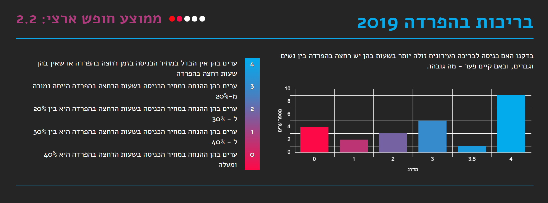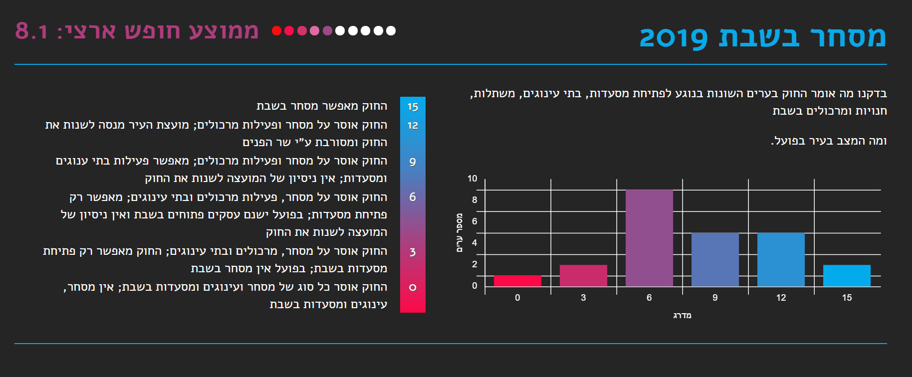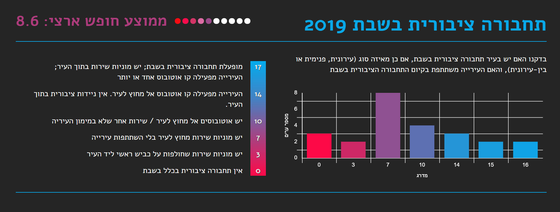 נתוני המדד הנוגעים לבאר שבע: תחבורה ציבורית בשבת נמצא כי אין תחבורה ציבורית בשבת. יש מוניות שירות אל מחוץ לעיר. בעונת הרחצה יש תחבורה שיתופית ״ימבוס״ מבאר שבע לחוף באשקלון. אין השתתפות עירייה. מסחר בשבת נמצא כי החוק אוסר על פתיחת חנויות, כולל מרכולים ובתי קולנוע ואולמות מופעים, בשבתות. החוק מחריג את מי שאינו יהודי. בפועל - יש מסחר בשבת באזורים ייעודיים ובתי הקולנוע פועלים