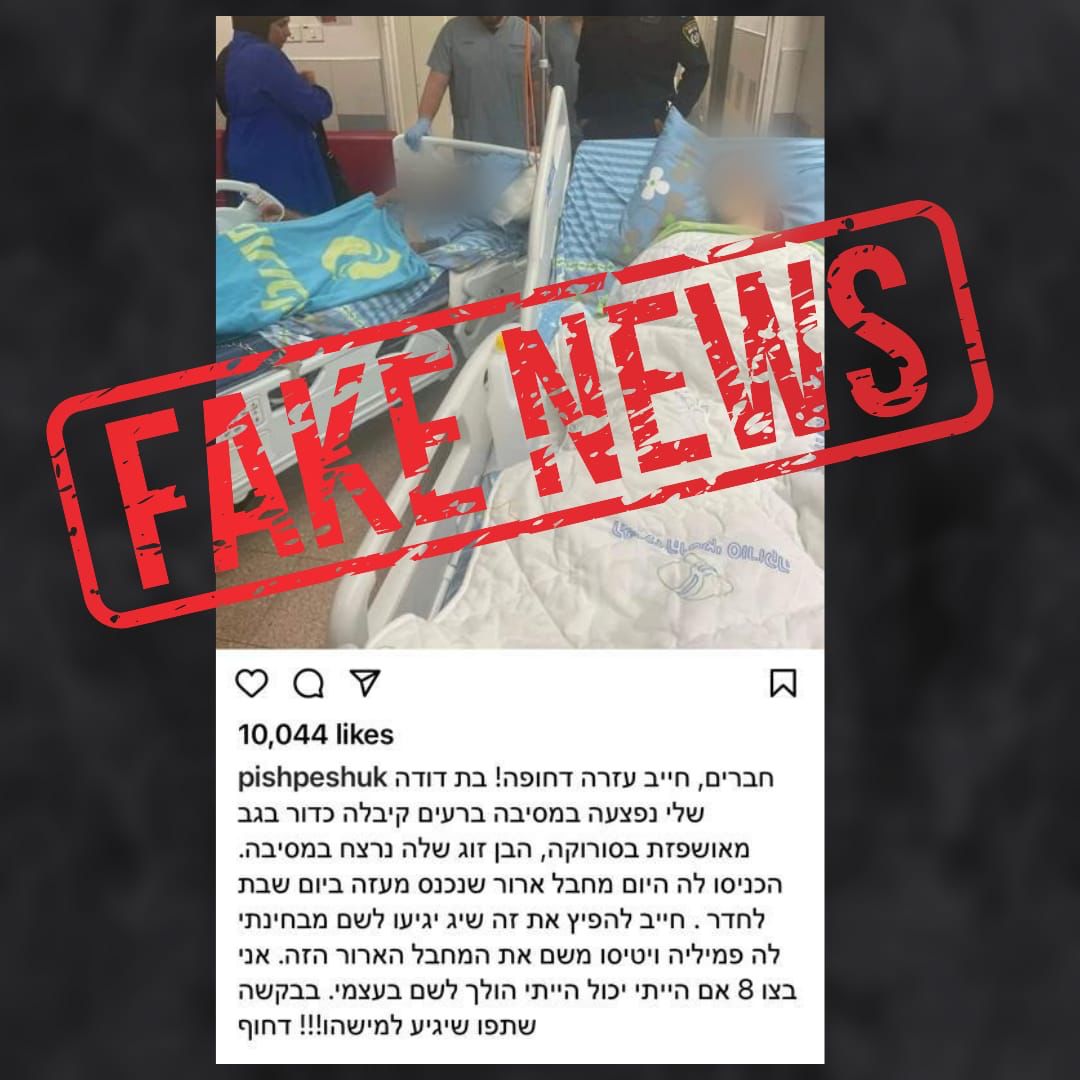 בשל כך, בבית החולים ובמשטרת ישראל מיהרו להגיב בנושאב וטענו כי מדובר בפייק ניוז. מסורוקה נמסר: "בשעה האחרונה מופצות ברשתות החברתיות ובקבוצות הווטסאפ הודעה כוזבת אודות מחבל שמאושפז כביכול בסמוך לפצועה מהלחימה. בצילום שפורסם מדובר באזרח ישראלי שאושפז לפני כעשרה ימים ואינו קשור לאירועים הנוכחיים".