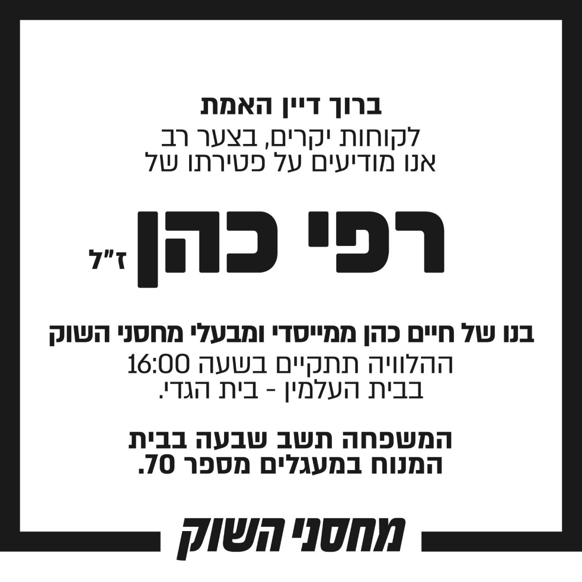 בעקבות פטירתו, מרשת מחסני השוק נמסר: ''רשת מחסני השוק, מרכינה ראשה על מותו הפתאומי של רפי כהן, בנו של חיים כהן, ממייסדיי ומבעלי רשת מחסני השוק, הנמצאת בבעלות משותפת של משפחות כהן ונעמן. ההודעה על פטירתו הפתאומית הותירה את כולם בהפתעה מוחלטת, מדובר באבידה גדולה. כהן היה אדם מיוחד במינו עם חזון, יצירתיות, ראש עסקי, נדבן ובעל חסד. ברוך דיין אמת".