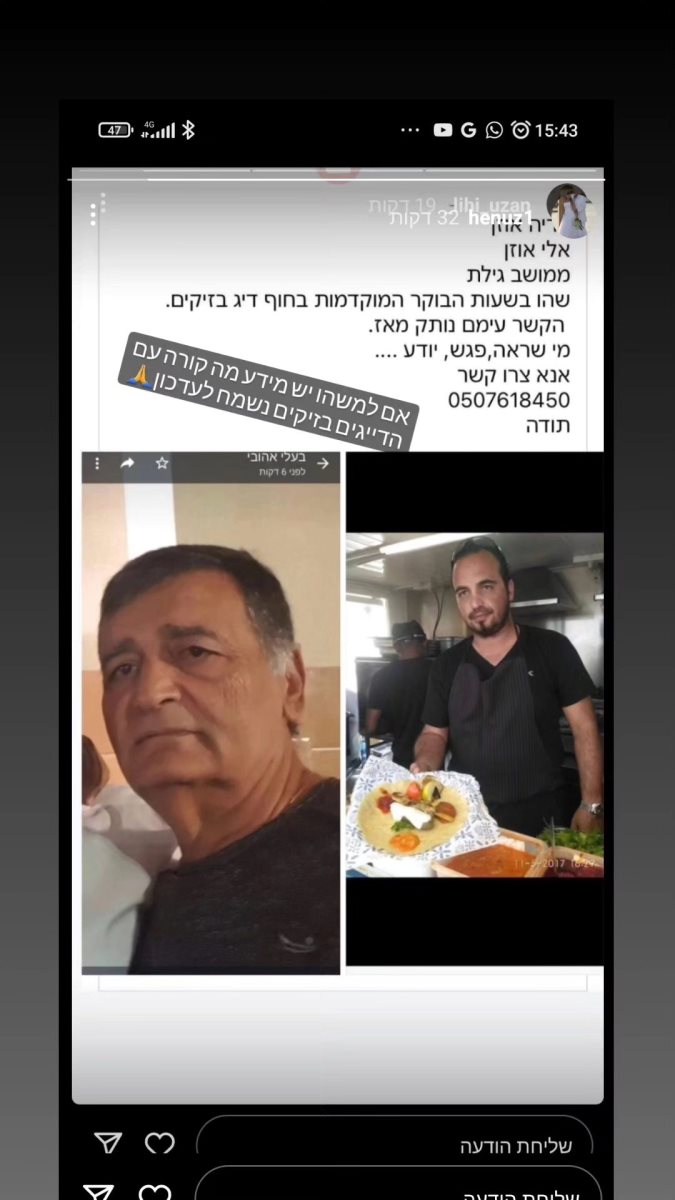השף אלי אוזן ממסעדת ״סלון יווני אשדוד״ נעדר מאז שבת בבוקר ביום שבת (7.10.23). אלי יצא יחד עם אביו אריה אוזן לדוג בחוף זיקים.
