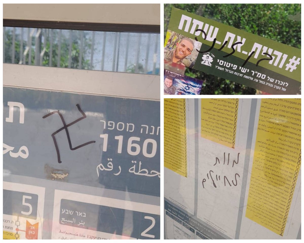 תושבי באר שבע התעוררו לפני מספר ימים למראות קשים במיוחד: כתובות נאצה קשות וחסרות רחמים רוססו על מספר תחנות אוטובוס בעיר, כשחלקן כוללות את הכיתוב "מוות לחיילים", צלבי קרס, ואפילו השחתה מכוונת של תמונתו של חייל שנפל במלחמה – עליה נכתב בבוז "בן זו*ה".