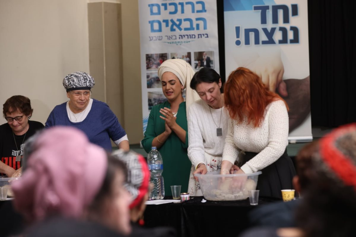 כ-100 נשים התכנסו אמש (ראשון) במרכז מוריה, בשכונה ד', בבאר שבע לקיים טקס הפרשת חלה ונשיאת תפילה להשבת החטופים, רפואת הפצועים ולשלום חיילי צה"ל.