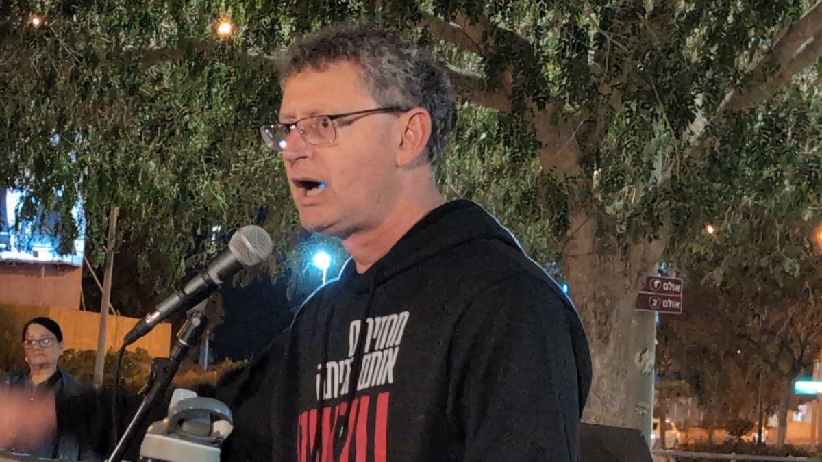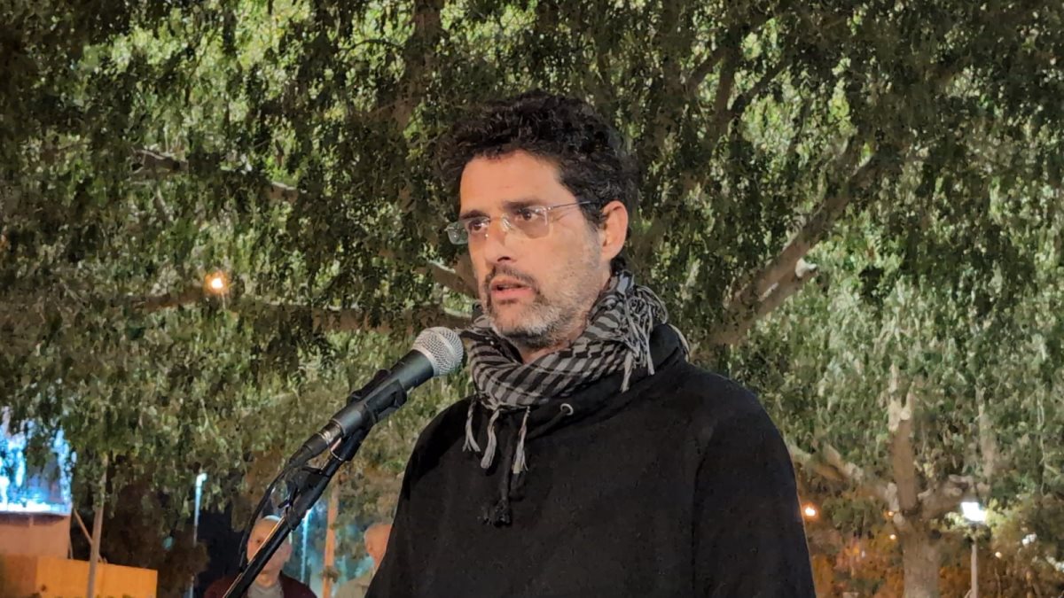 עזרי קידר, פעיל חברתי וסביבתי ממצפה רמון, מנכ"ל עמותת קשת הפועלת לקידום זכויות אדם וטבע בהר הנגב. הפגנת בחירות עכשיו בבאר שבע. קרדיט תניא ציון וולדקס
