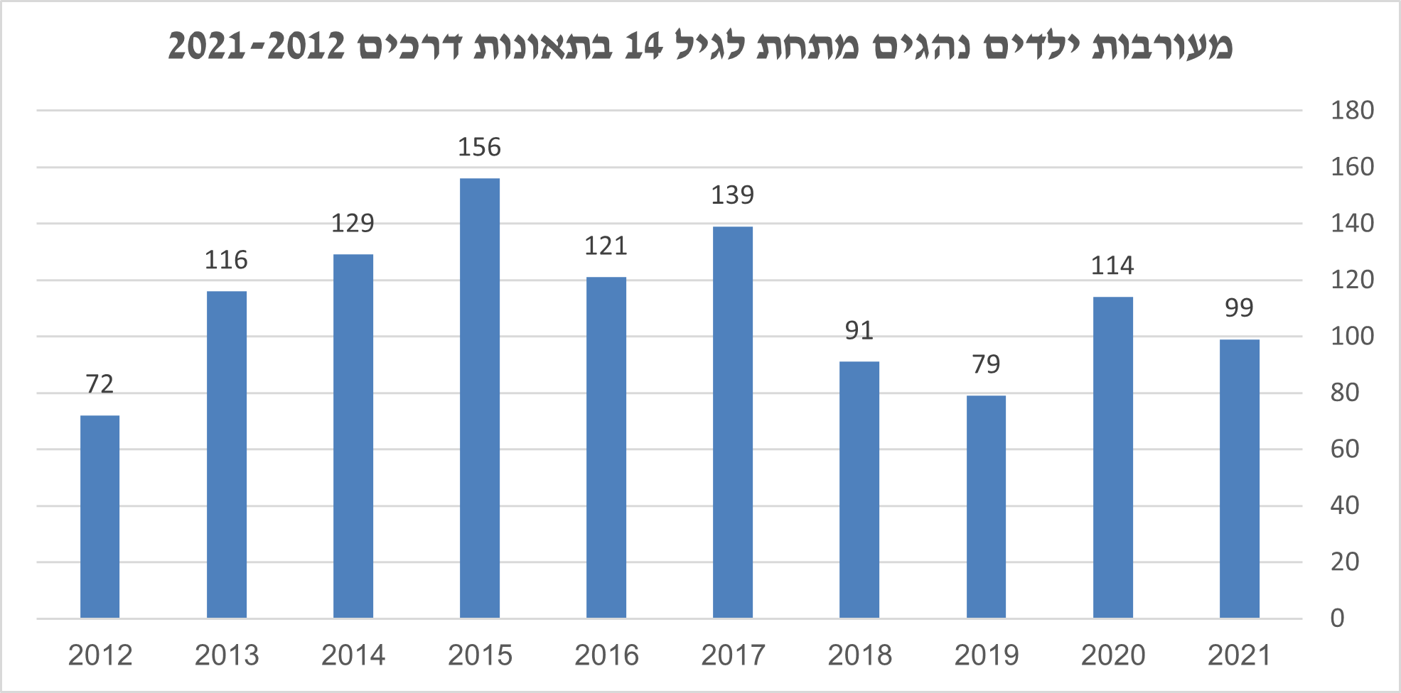 - 78 ילדים נהגים מתחת לגיל 14 היו מעורבים בתאונות דרכים בעשור האחרון (2021-2012) בירושלים.