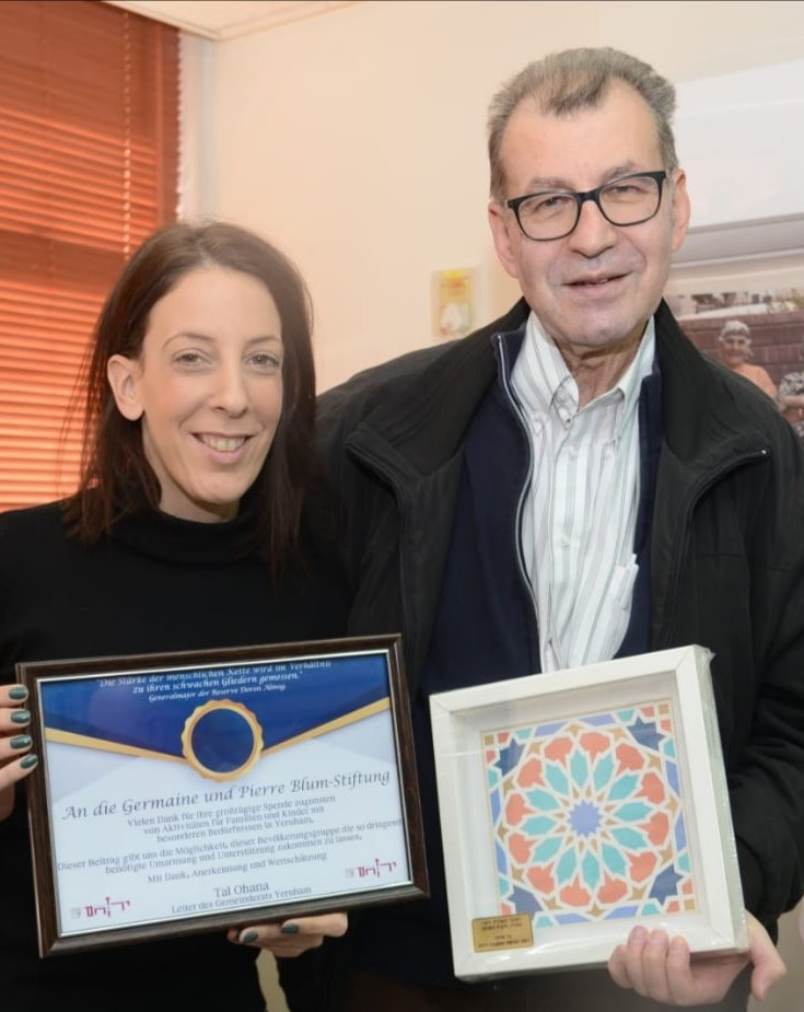 בטקס שהתקיים השבוע העניקה ראש עיריית ירוחם, טל אוחנה, תעודת הוקרה לנציגי קק"ל ו-JNF שוויץ על תרומתם למען פרויקטים בירוחם לילדים עם מוגבלויות כחלק מפעילותה של קרן בלום.
