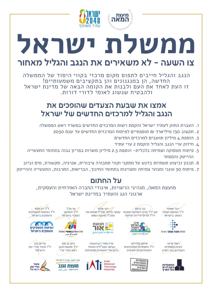 מועצת המאה , מנהיגי רשויות מקומיות בנגב ובגליל ואיגודי החברה האזרחית והעסקית יצאו אמש (ד') לקמפיין רחב תחת הכותרת "ממשלת ישראל - לא משאירים את הנגב והגליל מאחור"