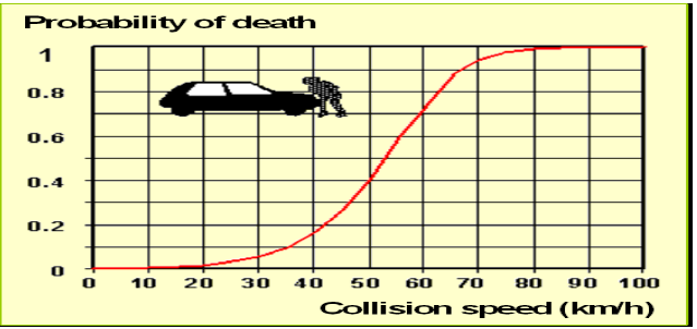 המחקרים מראים כי תוצאת התאונות עם כלי רכב ממונעים נקבעות בעיקר על ידי מהירות ההתנגשות, המראה כי הסיכוי לפגיעה קטלנית גדל משמעותית במהירויות של יותר מ- 30 קמ"ש (SWOV). הקשר שבין הסיכוי למוות ומהירות ההתנגשות בתאונות הולכי רגל חזיתיות: