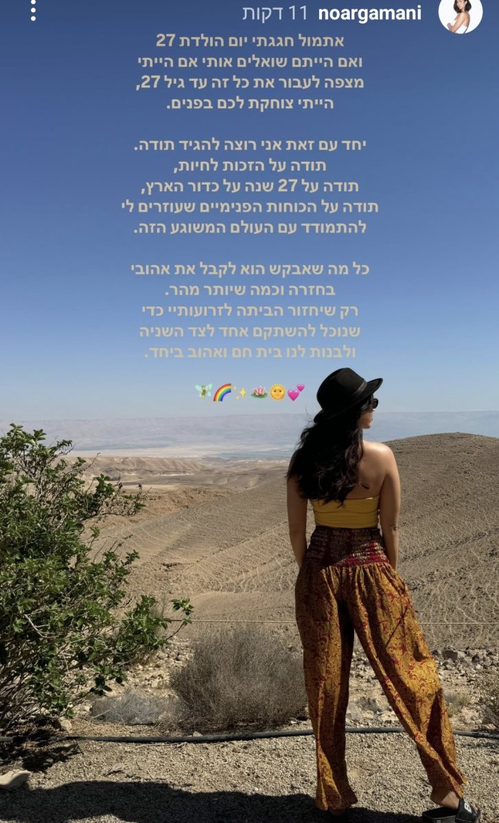 נועה ארגמני בפוסט יום הולדת 27 שהעלתה באינסטגרם הפרטי, והקדישה אותו בעיקר לרצון שבן זוגה, אבינתן אור, יחזור אליה במהרה: