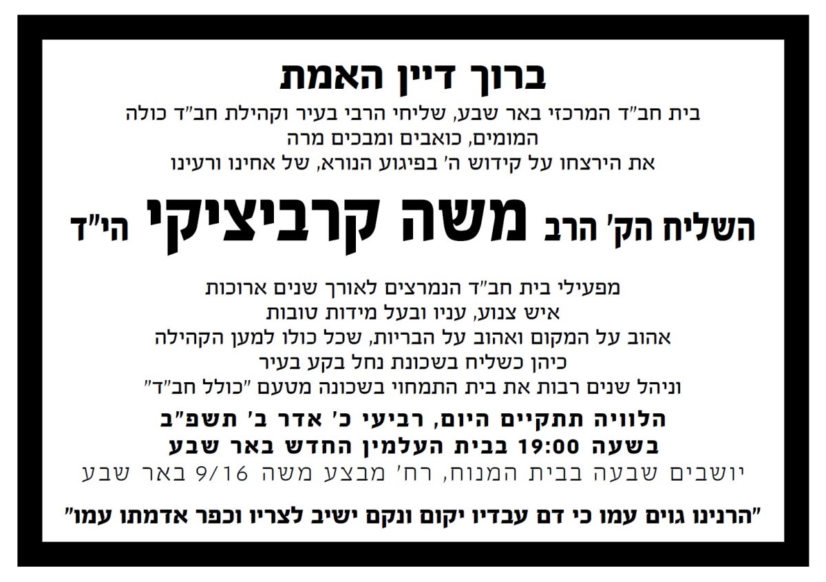 מועד הלוויתו נקבע לפני זמן קצר של שליח חב"ד בבאר שבע. חברים ומשפחתו של הרב האהוב, אשר רכב על אופניו אמש ונרצח באכזריות, ספדו לו בכאב ברחבי הרשת