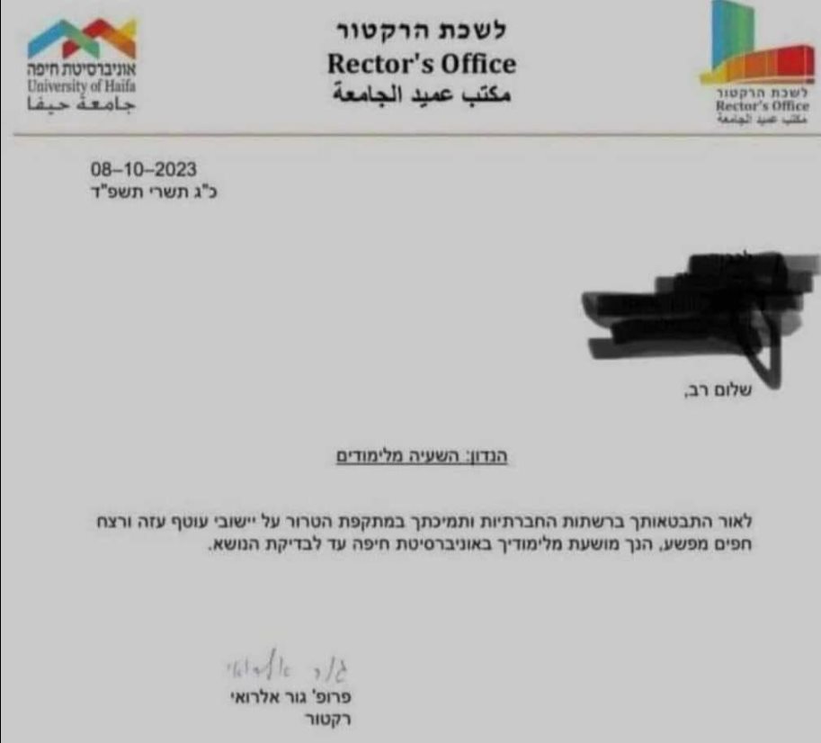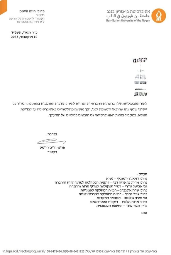 כעת נדמה כי האיום מתממש, כאשר כפי שמפרסם היום הכתב אורי סלע, שלחה אוניברסיטת בן גוריון מכתב השעייה לסטודנט שהביע ברשתות החברתיות עמדת תמיכה במתקפת הטרור הרצחנית בדרום. במכתב נרשם: "לאור ההתבטאויות שלך ברשתות החברתיות הנחזות להיות הודעות התומכות בהתקפת הטרור על יישובי עוטף עזה שהובאו לתשומת ליבנו, הנך מושעה מהלימודים באוניברסיטה עד לבדיקת הנושא. במקביל בוחנת האוניברסיטה גם היביטים פליליים של הודעתך".