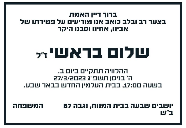 בראשי, יליד ירושלים במקור אשר התגורר בבאר שבע משנת 1960 - הפך במרוצת השנים לאחד האישים החשובים בנגב ומי שתרם רבות לפיתוחו. הוא יובא היום למנוחה אחרונה בבית העלמין בבאר שבע