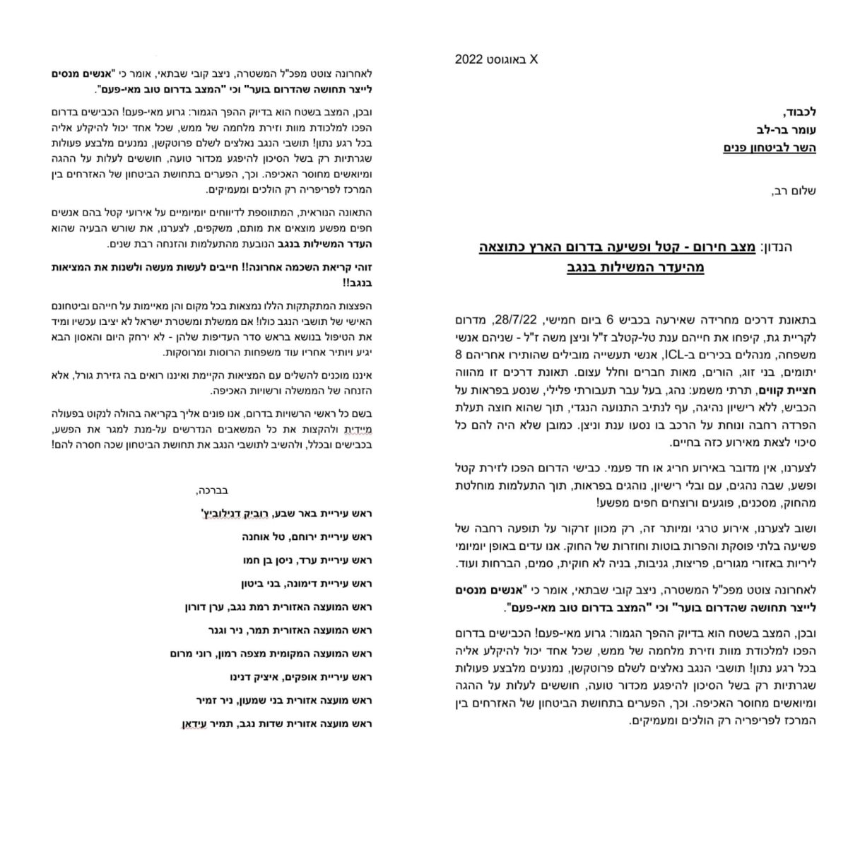 "זוהי קריאת השכמה אחרונה! חייבים לעשות משהו ולשנות את המציאות בנגב" הצהירו ראשי הרשויות כשלבסוף הם פונים באופן ישיר לשר בר לב - "בשם כל ראשי הרשויות בדרום, אנו פונים אלייך בקריאה בהולה לנקוט בפעולה מיידית ולהקצות את כל המשאבים הנדרשים על מנת למגר את הפשע, בכבישים ובכלל - ולהשיב לתושבי הנגב את תחושת הביטחון שכה חסרה להם".