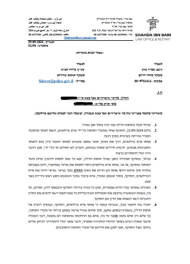 במכתב ששלח ברי למפקד מחוז דרום, ניצב אמיר כהן ולמפקד תחנת שדרות, סגן ניצב מידד לביא - טוען עורך הדין כי אותה דמות שתועדה מכה את שני העובדים, היא זאת של סגנו של רוביק דנילוביץ': ''מרשי עובד בתחנת הדלק כפר עזה בתור סגן מנהל'', טוען אבן ברי בתחילת המכתב והוסיף ''ב-22.9, הותקף אחד מעובדי התחנה על ידי איש מילואים, וזאת לאחר שהעובד הפעיל מוזיקה בערבית בתוך רכבו. אותו איש מילואים, דרך את נשקו, סתר מספר פעמים לאותו העובד ורק בנס ולאחר התערבות אנשים, לרבות חיילים ששהו במקום, העניין לא הסלים עד כדי ירי, שכן הדבר היה יכול להסתיים ברצח. מרשי, מתוקף תפקידו כסגן מנהל תחנת הדלק, יצא על מנת לנסות ולהבין מדוע עובד התחנה מותקף, או אז, אותו איש מילואים ניסה לתפוס את מרשי מצווארו, הלם באגרופו בחזהו תוך שהוא דוחף אותו וכן הרים את נשקו הדרוך בפני מרשי''.