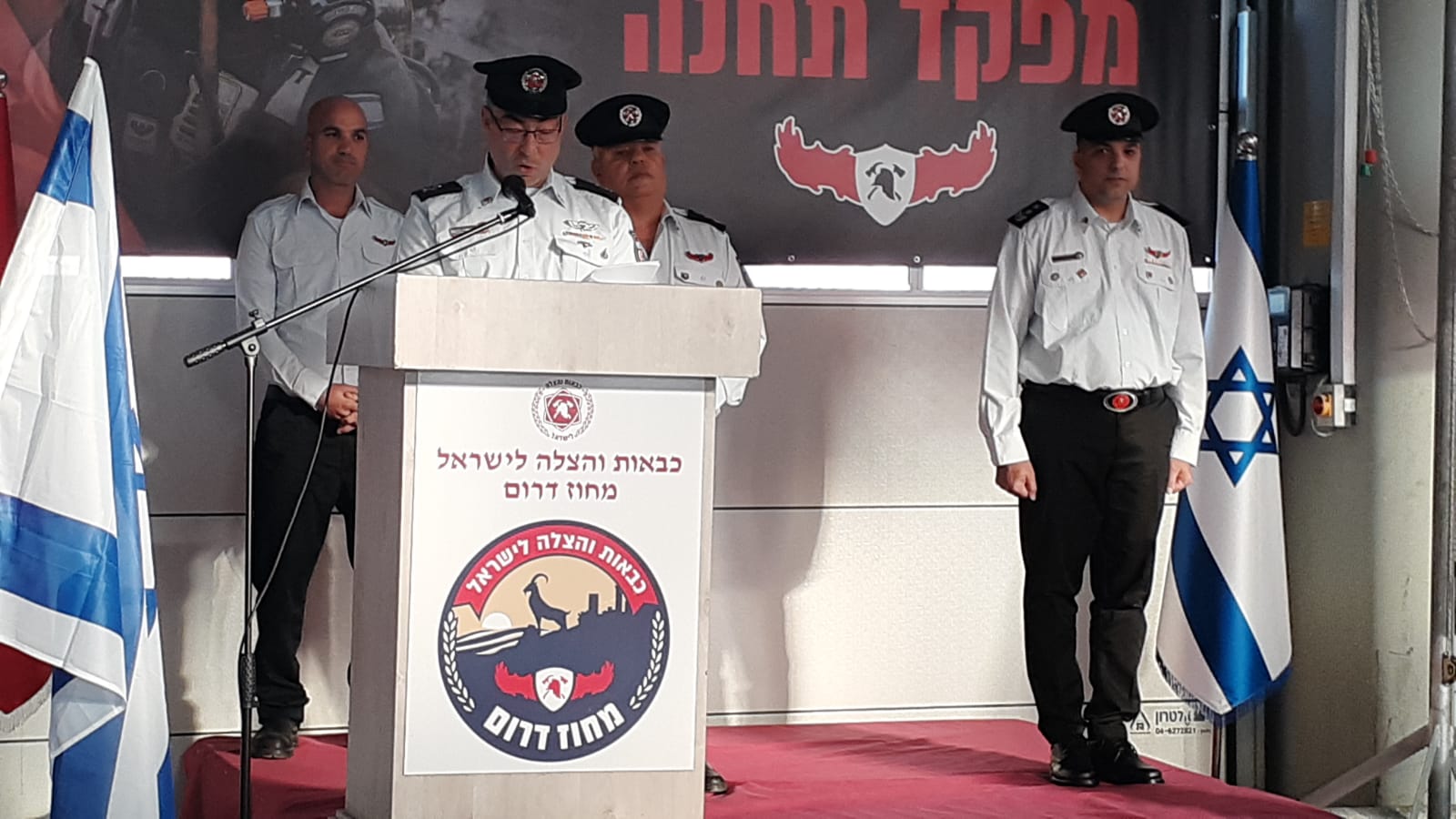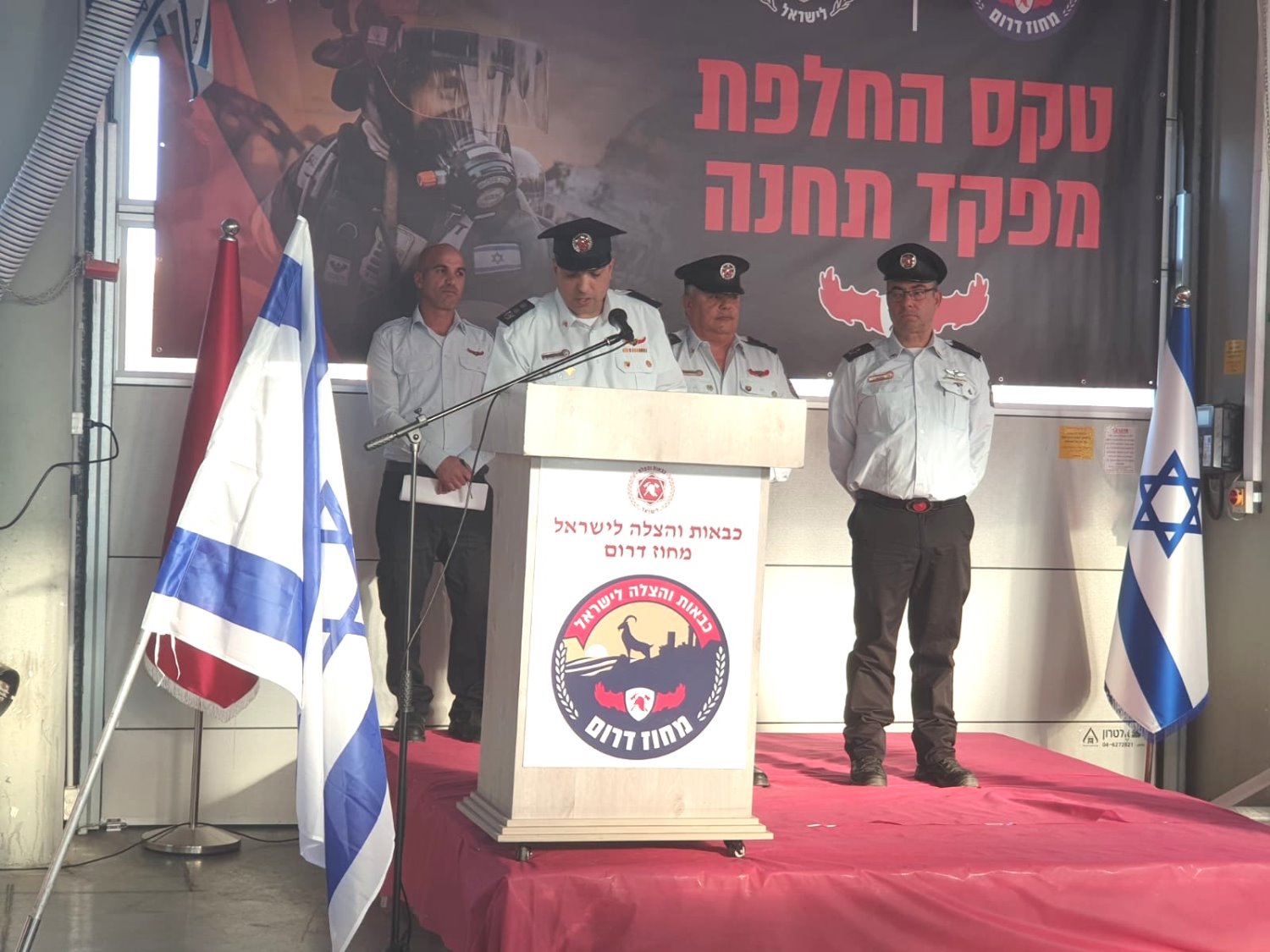 טקס החלפת מפקדים בכיבוי והצלה מחוז דרום. המפקד היוצא לאחר שמונה שנות פעילות טפסר משנה אלי פרץ, המפקד הנכנס טפסר-משנה משה עמר