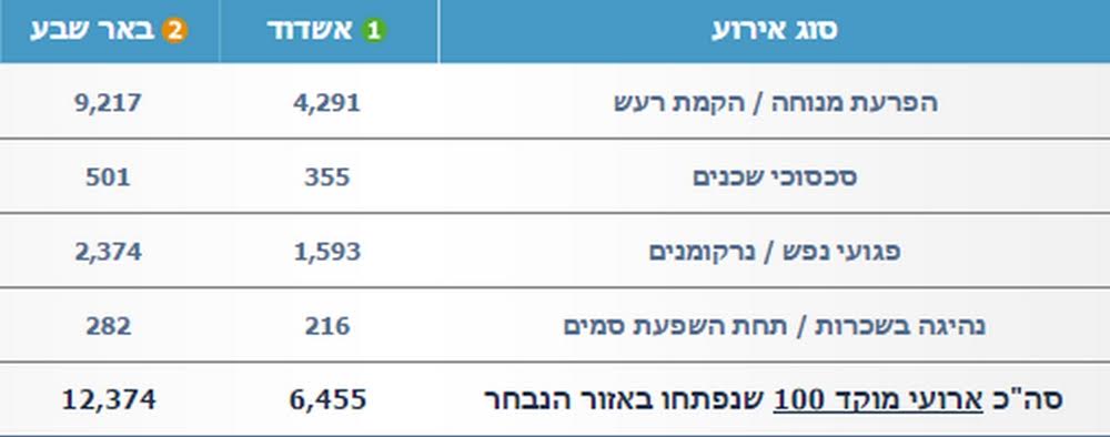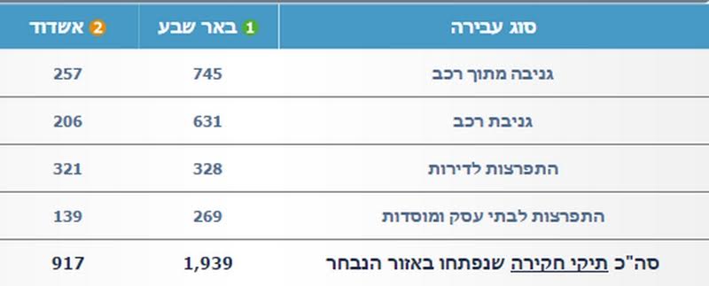 במשטרת ישראל הוציאו דו"ח רבעוני המפרט את העבירות השונות ותיקי החקירה שנפתחו בעקבותם. בין העבירות הרבות: הקמות רעש, גניבות ופריצות, אלימות ונהיגה בשכרות. וגם: איפה באר שבע עומדת ביחס לשנה שעברה?