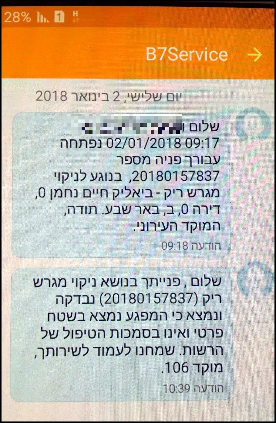 מעיריית באר שבע נמסר בתגובה: "בניגוד לטענות, בשכונה ב' בוצע ניקיון שכזה והפסולת הועברה לשטח פתוח לשם איסוף ע"י מנוף. שיטה זו פועלת היטב וניכרת ירידה משמעותית בפניות הציבור על מפגעי פסולת גושית. אגף לאיכות הסביבה פועל באמצעות צוותים רכובים לאסוף פסולת גושית ברחבי העיר, במקומות שאין גישה וכניסת למנוף".