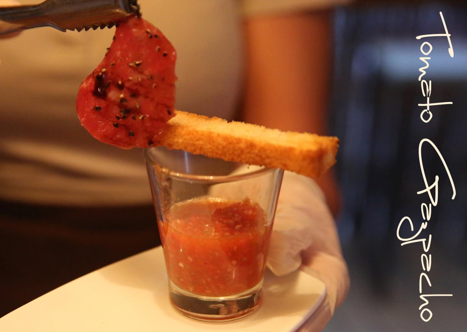 טוחנים במג'ימיקס עם בצל, שום, בזיליקום, נענע, מלח ופלפל, עד לקבלת מרק נוזלי, אדום, אחיד ובלי גושים.