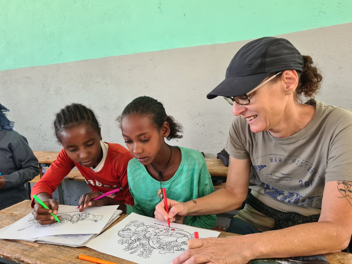"נחתנו באדיס אבבה וחצינו אותה בדרכנו לדברה זית. המראות המוכרים של רחובות אפריקה, עמוסים באנשים, ריחות וצבעים שמיד גרמו לי להיזכר כמה אני אוהבת את היבשת הזו. הגענו בשעת ערב לדברה זית ולמחרת בבוקר נסענו לבית הספר. קיבלו אותנו בטקס מרשים בבית הספר ופגשנו מאות ילדים ששמחו לקראתנו וקיבלו אותנו בחיוכים וחיבוקים. התרשמנו ממצב בית הספר, הכיתות המוזנחות, השטח הגדול של החצר שהיה ריק מכל דבר וזה היה השלב שהתחלנו לחשוב איך אנחנו משנים פה את המצב."