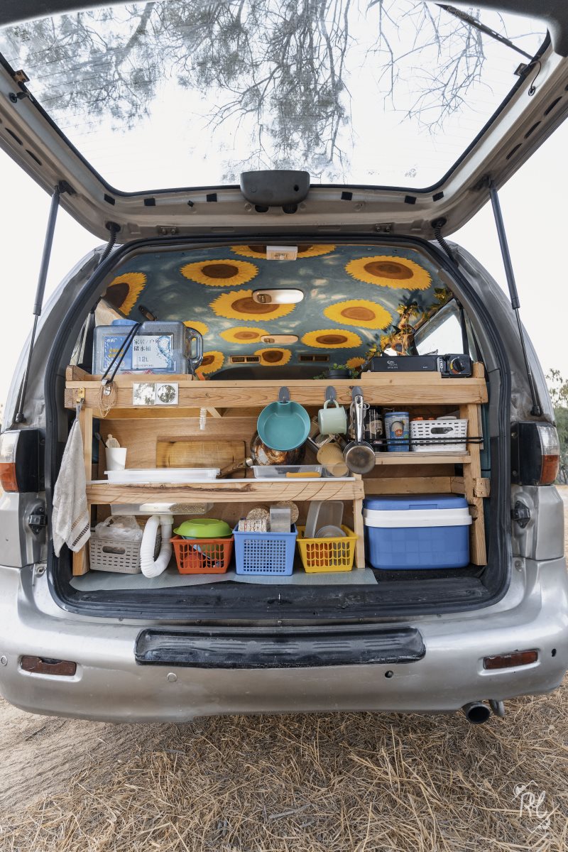 זה ממש פשוט, כל אחד יכול ללכת לישון באוטו שלו. בניתי מטבח, אני יכולה לבשל פה, יש לי גזיה וכירה ניידת, יש לי ג'ריקן וכיור, אני ממלאת מים בכל פעם שאני צריכה.