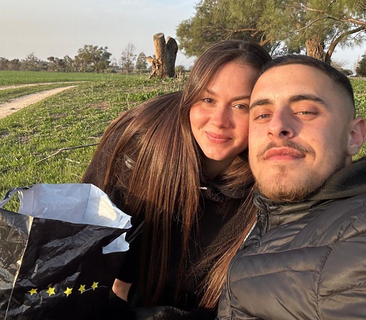 "הכרנו בצבא בשטח בדיוק לפני שנה בחג שבועות. הייתה איזו פעילות ואני עמדתי עם חברה מהבסיס ואוהד בדיוק יצא. החברה אומרת לי תראי אותו, זה בול בשבילך, ממש חתיך. הסתכלתי עליו ואמרתי בהתחלה שזה לא הטעם שלי וגם הייתי בדיוק אחרי פרידה מחבר, אבל החברה התעקשה שאראה אותו על מדים כחייל הכי חתיך שקיים, ואני ועניתי "נראה". הוא הסתכל עליי ומשם עברנו לסיור. כשגיליתי שחסר לי מטען לנייד הלכתי דווקא לאוהד בג'יפ וביקשתי ממנו, פתחנו בשיחה והוא סיפר לי עצמו. היה מאוד נחמד לדבר איתו ונפרדנו לשלום מבלי לדעת מה השם של כל אחד. בסוף הוא שאל את המפקד מה שמי ועשה לי עוקב באינסטגרם, אבל לא ראיתי באותו יום כי התייבשתי בשמש, לא הרגשתי טוב ונרדמתי מוקדם. למחרת ראיתי וסיפרתי לכל החברות שלי, התחלנו לדבר ומשם נהיינו חברים ממש טובים. היה לי כיף לדבר איתו כי הוא מאוד הצחיק אותי, התגלה כבחור שמח, תמיד אמר לי שני משפטים: 'תחשבי טוב, יהיה טוב' או 'מחשבה יוצרת מציאות', ומשם הכל התגלגל עד שנהיינו זוג אוהבים".