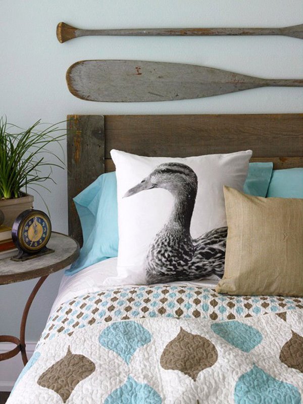 בחדר השינה- את רוב העבודה תוכלו לעשות בעזרת מצעים בהירים בגוונים לבן וכחול ולהשלמת האווירה תוכלו לתלות על הקיר גלשן או אפילו משוט מעץ: