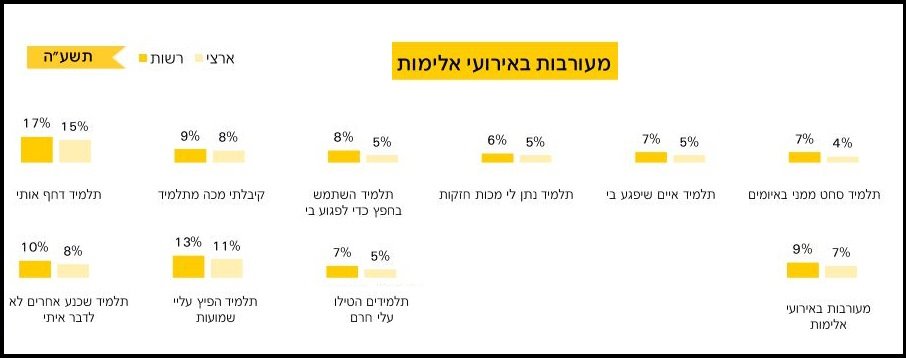 לסיכום, בבאר שבע 9% מהתלמידים מעורבים במקרה אלימות בטווח זמן של חודש אחד, לעומת "רק" 7% אירועי אלימות בשאר המדינה.