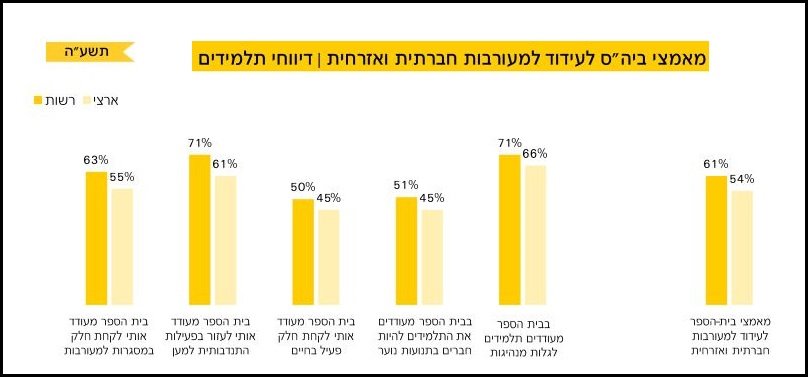 63% מהנשאלים ציינו שבית הספר מעודד אותם לקחת חלק במסגרות למעורבות חברתית. אם המספר הזה נראה לכם נמוך, תתעודדו שהממוצע הארצי עומד רק על 55%.