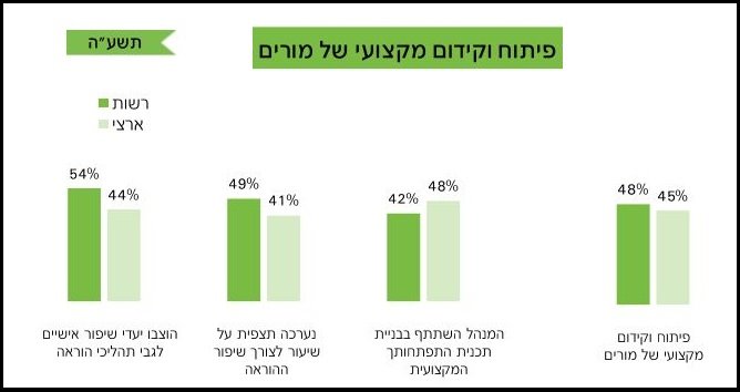 באר שבע עומדת על 3% מעל הממוצע הארצי בפיתוח וקידום מקצועי של מורים בשיעור של 48%. 54% מהמורים ציינו כי הוצבו יעדי שיפור אישיים לגבי תהליך ההוראה, לעומת 44% בשאר הארץ, 49% שיתפו כי נערכה תצפית על שיעור לצורך שיפור ההוראה לעומת 41% בממוצע הארצי. ואולם כשנשאלו האם המנהל השתתף בבניית תכנית ההתפתחות המקצועית, 42% ענו שכן, 6% פחות מהממוצע הארצי.