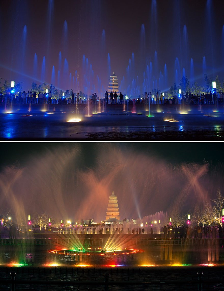 למרגלות "פגודת אווז הבר הגדול" (תרגום חופשי), המזרקה המוזיקלית עומדת על 168,000 מטר מרובע כשהפגודה עומדת במרכזה. במזרקה 1024 זרנוקי מים מסונכרנים למוזיקה ורוקדים באופן מרהיב במיוחד. (מקור: visitourchina)