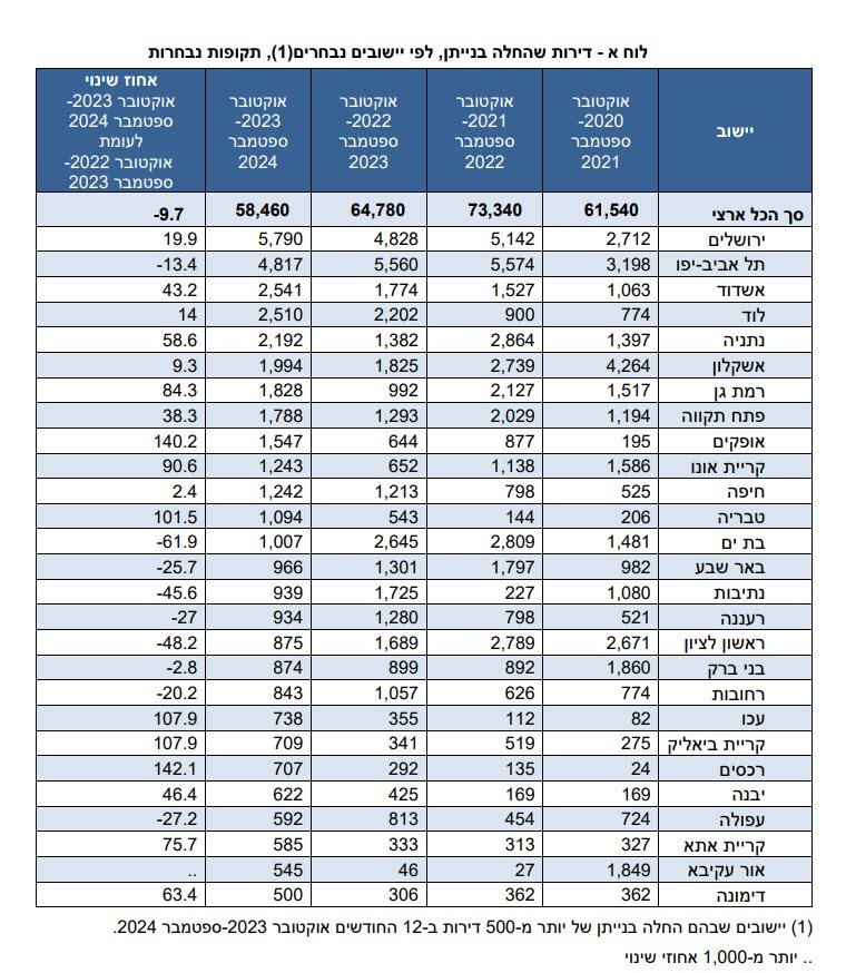 הלשכה המרכזית לסטטיסטיקה (הלמ"ס) מפרסמת נתונים על התחלות הבנייה ברחבי הארץ בשנה האחרונה. ההשוואה מתבצעת בין החודשים אוקטובר 2023 - ספטמבר 2024, לבין אותה התקופה בשנה הקודמת לכך.