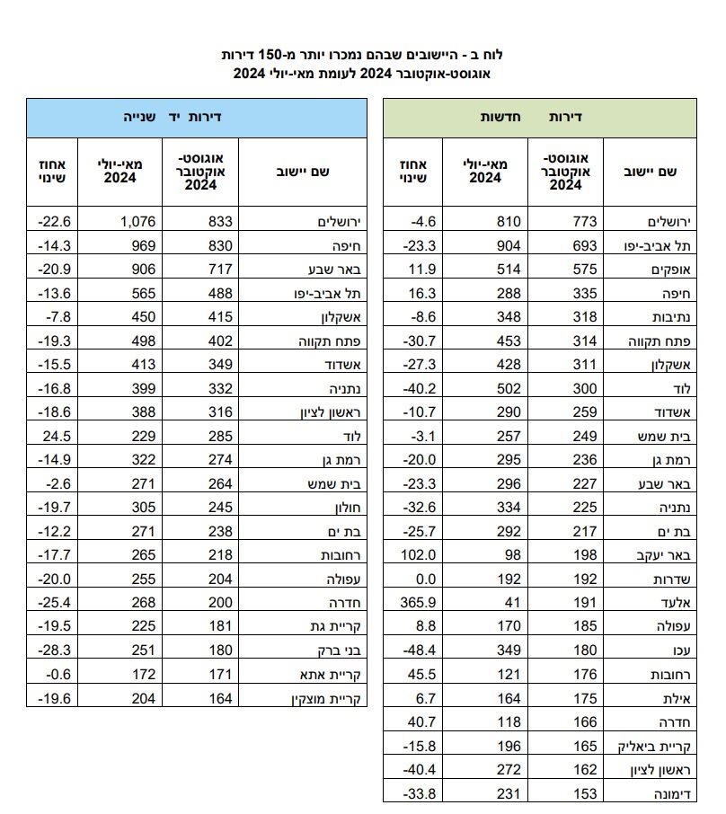 הנתונים המלאים של מכירת דירות חדשות ויד שניה בחלוקה לערים: