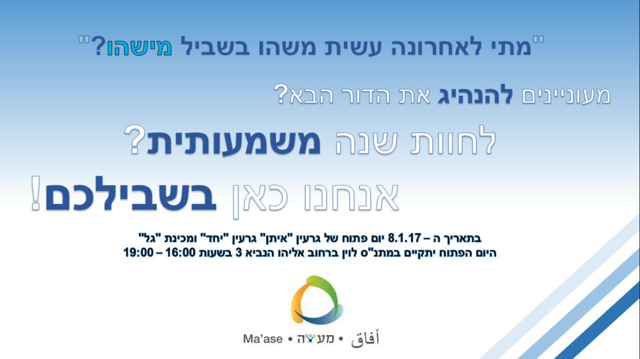 גרעין "איתן" באר שבע מזמין את הי"בניקים בעיר ליום פתוח של מעשה, לשמוע ולהתרשם משנת שירות או מכינה.
