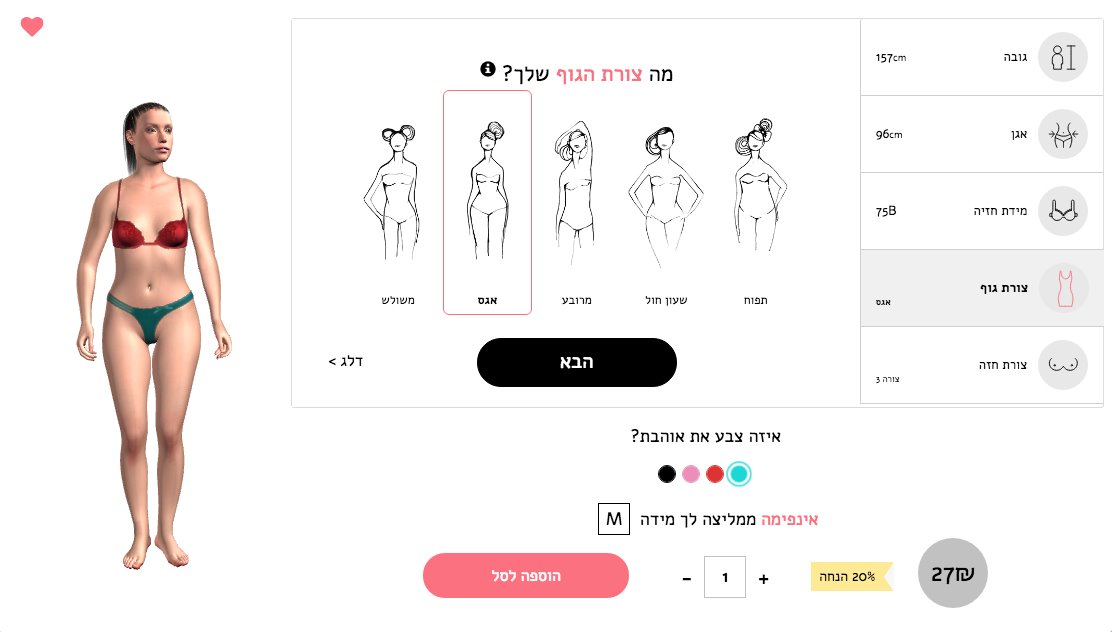 כעת כל שעליך לעשות זה לעצב בקלות את הדמות על ידי בחירת המידות שלך, כמו למשל: גובה, היקף אגן, מבנה הגוף שלך, מבנה החזה ומידת החזיה. הדמות תעדכן בזמן אמת בהתאם למידות וכמובן שתוכלי לסובב אותה ולראות איך הפריט נראה על מבנה הגוף שלך מכל הכיוונים.