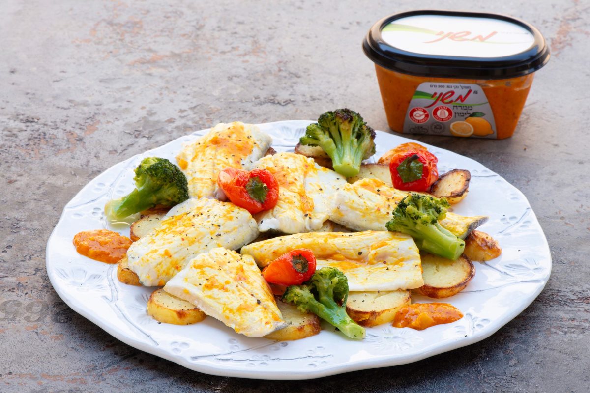 - מסדרים על צלחת הגשה את הדג והירקות ומגישים בתוספת תלוליות ממרח לימון על הצלחת. בתיאבון!