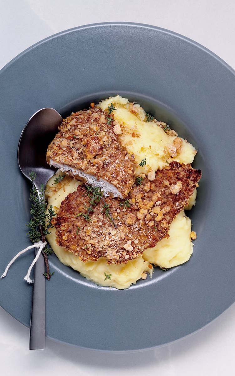 - בשתי צלחות הגשה מניחים מחית תפוחי אדמה בצד אחד ואת נתחי העוף בצד השני. מגישים עם ירקות טריים.