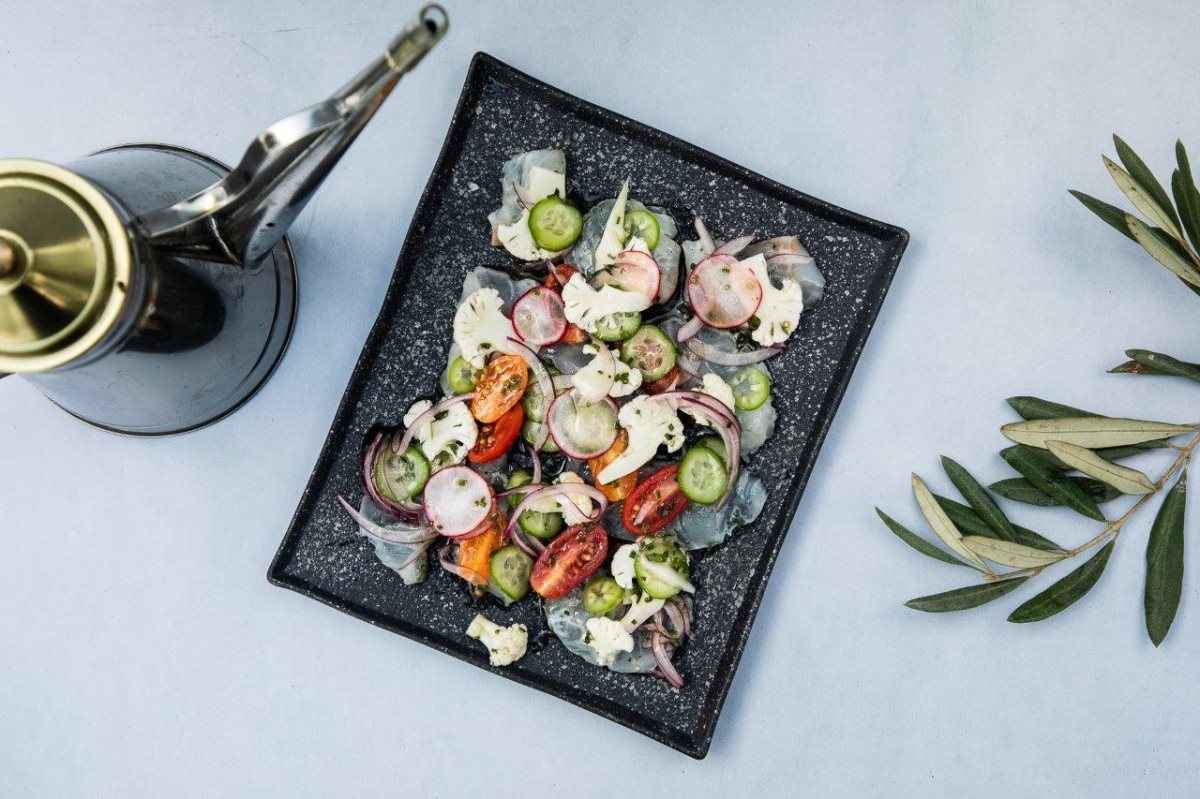 טרטר בר ים בשמן זית עם סלט ים תיכוני