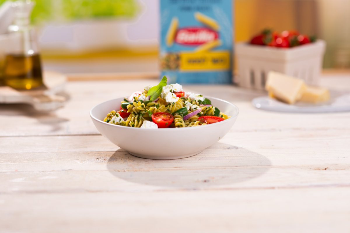 סלט פסטה מרענן עם עגבניות שרי וגבינת פטה המשלב טעמים ים-תיכוניים