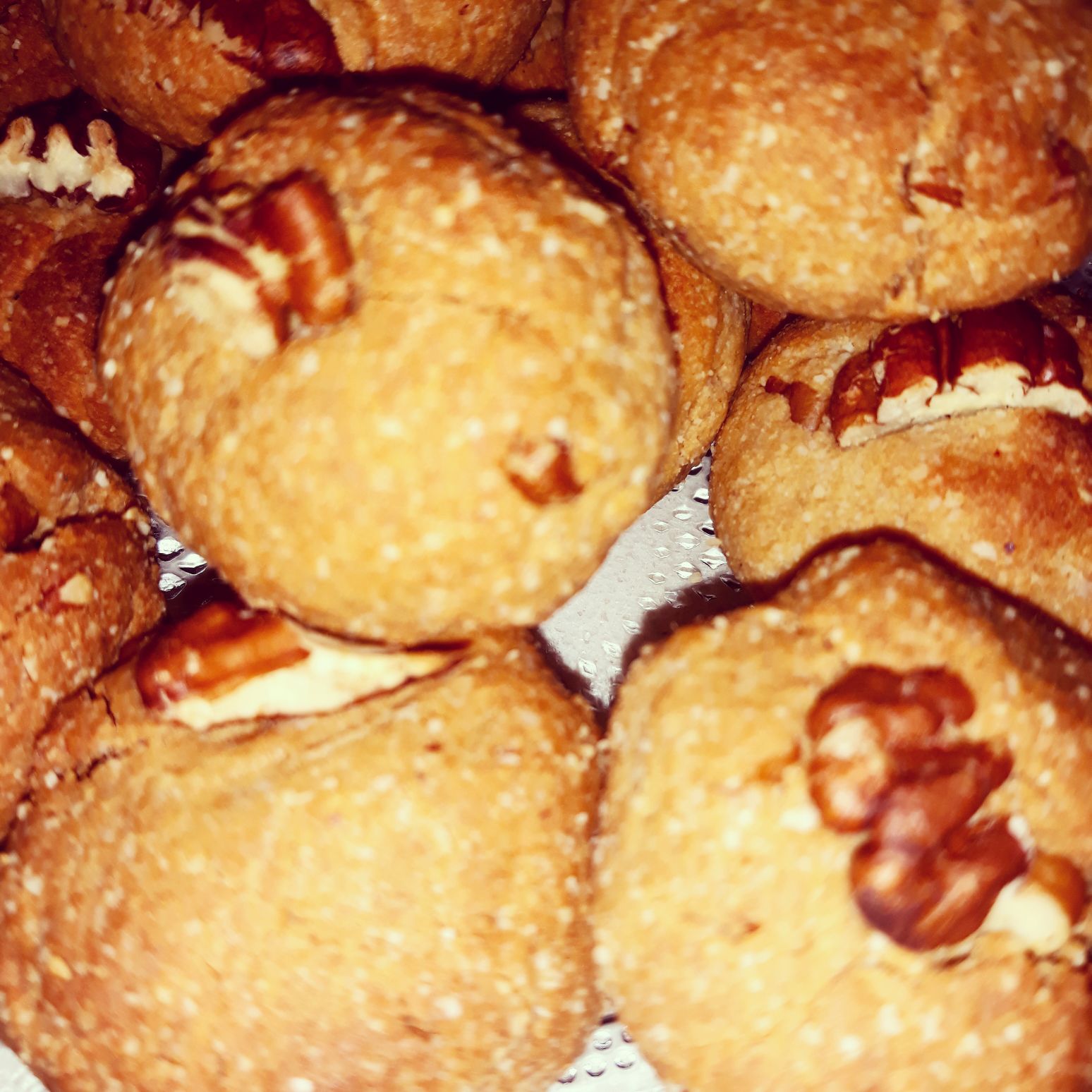 לעבד את כל המצרכים יחד, ליצור עיגולים ולשטח מעט, לנעוץ פקאן קצוץ מעל ולאפות 10 דקות בתנור 150 מעלות.