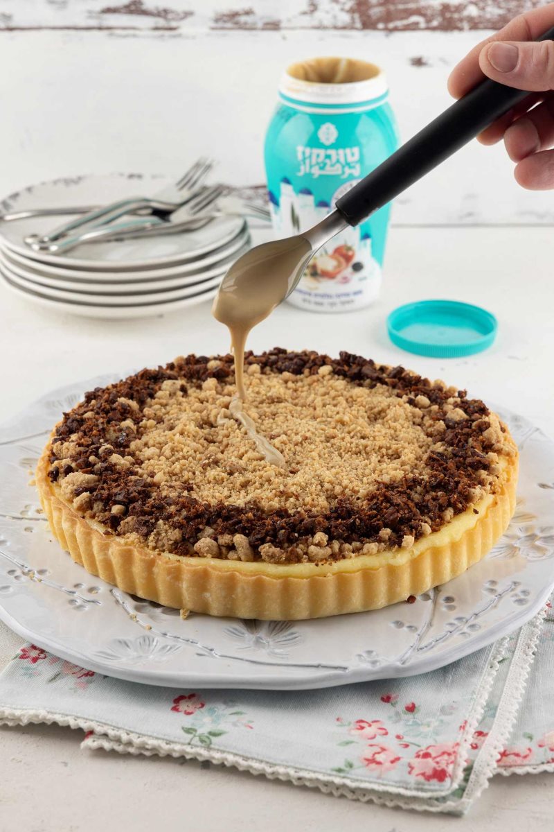 - מפזרים את הקרמבל על העוגה ומקשטים מסביב בפקאן המסוכר. מזליפים מעט טחינה גולמית מעל ומגישים.
