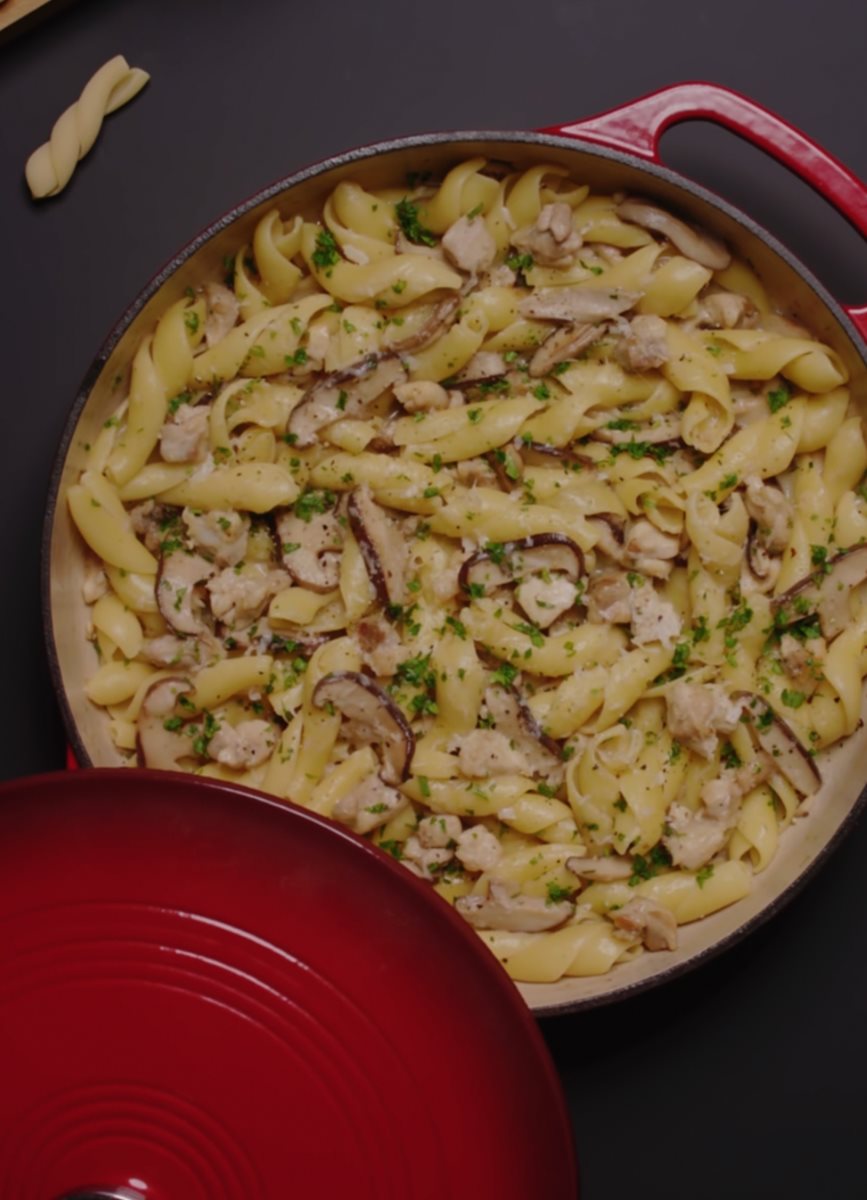 כשנותרו חמש דקות לבישול הפסטה, מוסיפים את העוף ומערבבים, וממשיכים בבישול עד שהעוף והפסטה מוכנים. מכבים את האש, מפזרים גבינת פרמז'ן טבעונית מלמעלה לפי הטעם ומערבבים עד לאיחוד הרוטב.