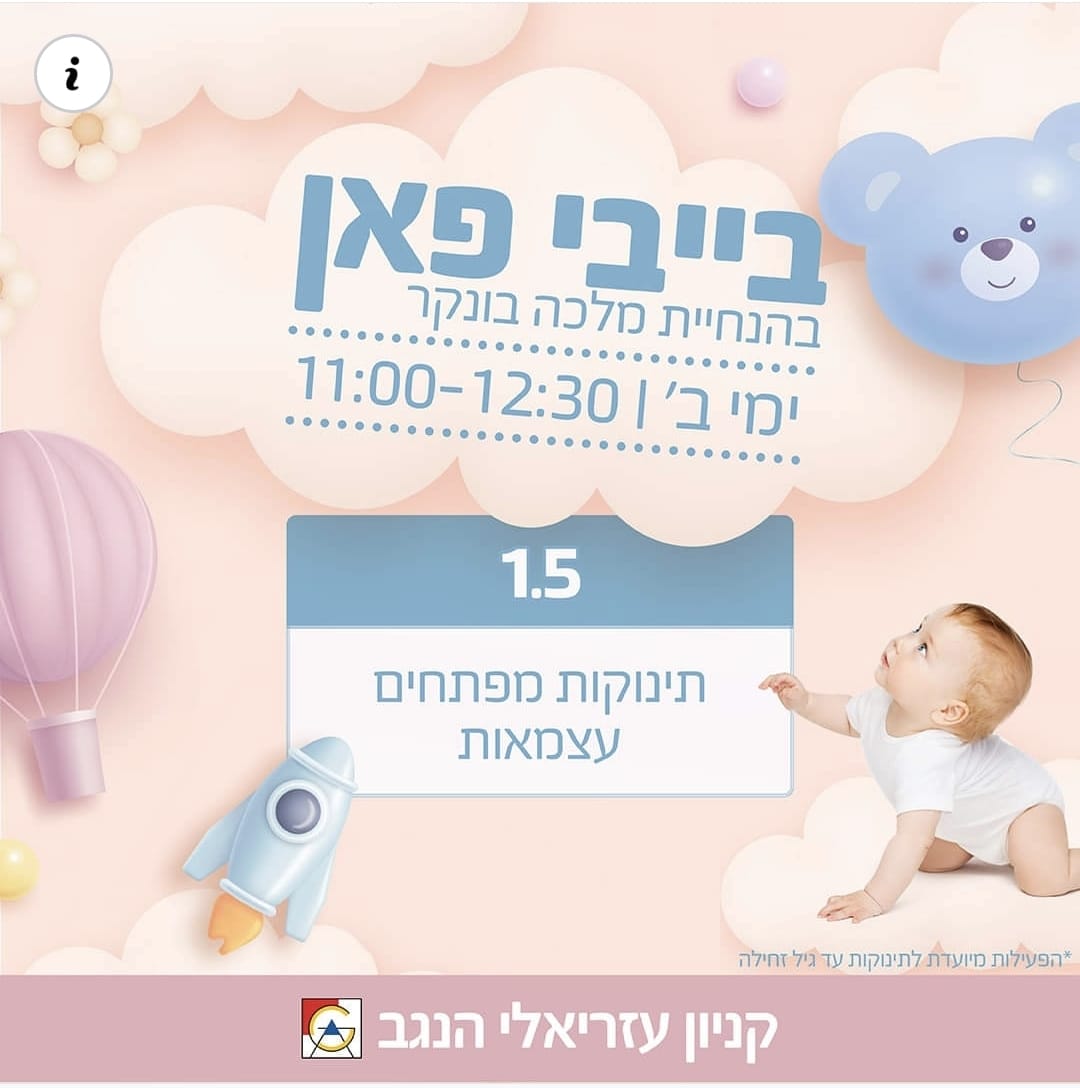 קניון עזריאלי הנגב מזמין אתכן להגיע עם הבייבי לקניון בכל יום שני לאורך חודש מאי בין השעות 11:00-12:30 וליהנות משלל פעילויות והרצאות מגוונות וקסומות במיוחד בהנחיית מלכה בונקר , שמחכה כבר לפגוש אתכם!
