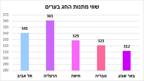 באר שבע נמצאת מתחת לממוצע הארצי עם 312 שקלים. מקדימות אותה טבריה עם 321 שקלים, חיפה עם 329 שקלים, תל אביב עם 341 שקלים והרצליה בראש עם 361 שקלים למתנת חג.