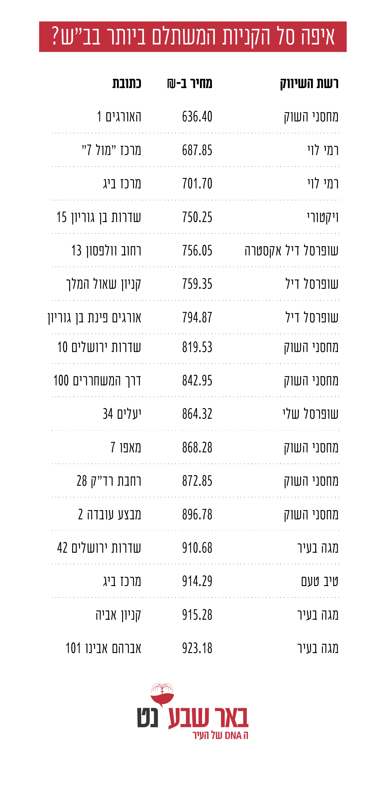 רשת השיווק הזולה ביותר לרכישת סל קניות לחג הפסח היא מחסני השוק הממוקמת ברחוב האורגים, עם סל קניות בעלות כוללת של 636.40 ₪. במקום השני נמצא הסניף השני של רמי לוי ב"מול 7", עם עלות סל של 687.85 ₪. במקום השלישי גם רשת רמי לוי שבמרכז ביג, המציעה לכם סל קניות בעלות של 701.70 ₪. לעומת זאת, רשת השיווק היקרה ביותר היא מגה בעיר ברחוב אברהם אבינו עם סל קניות שעלותו היא 923.18 ₪. ממש לפניו נמצא עוד סניף של רשת מגה בעיר, בקניון אביה שיספק לכם סל בעלות של 915.28₪. לפניו נמצא טיב טעם במרכז ביג שהקנייה בו תעלה לכם 914.29 ₪.
